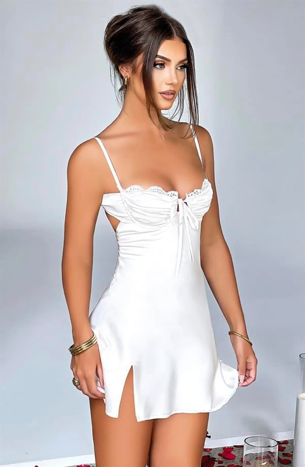 Beyaz Yırtmaç Detaylı Fantezi Mini Club Elbisesi
