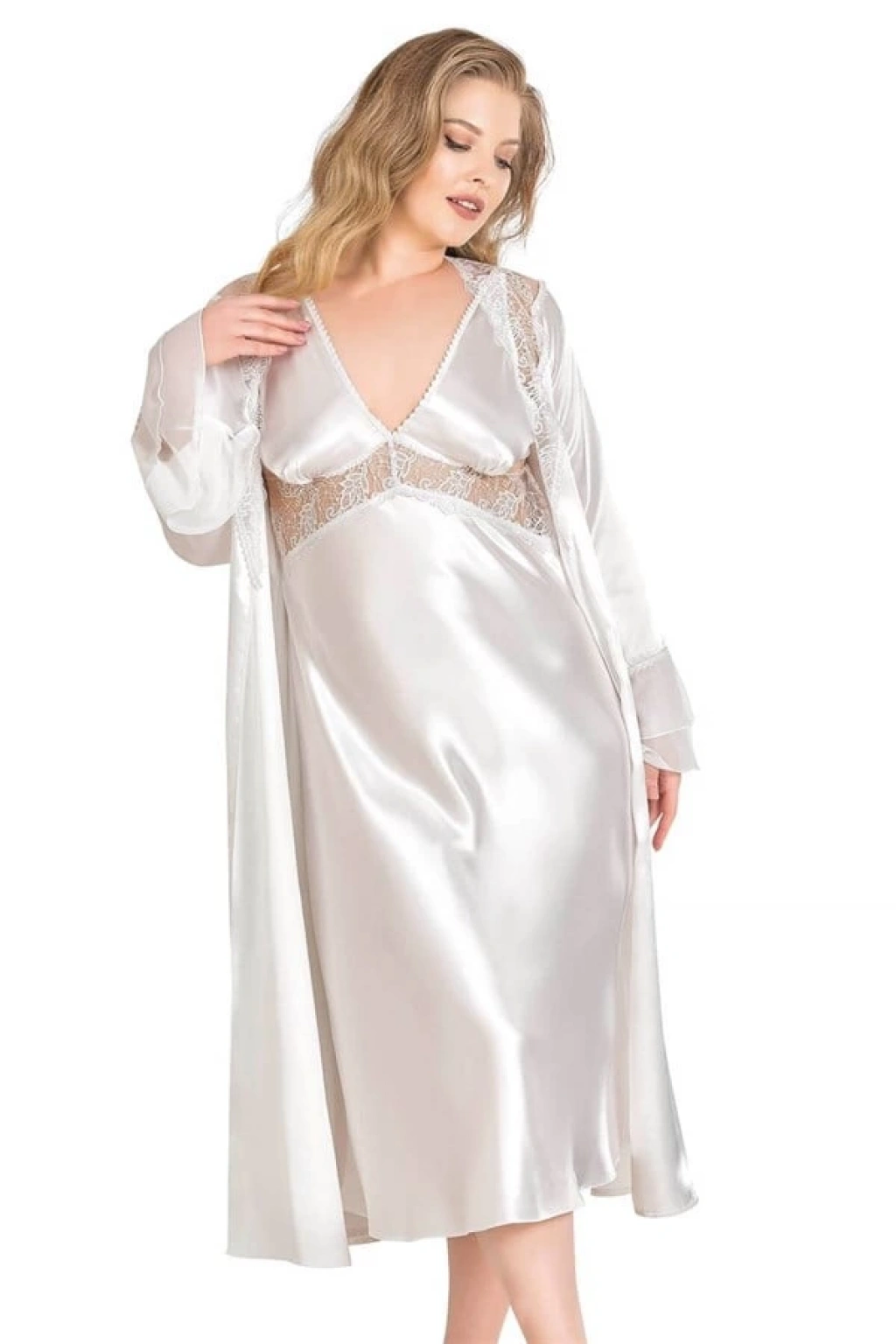 Aria's Büyük Beden Ekru Uzun İkili Saten Sabahlık Gecelik Takımı 6169