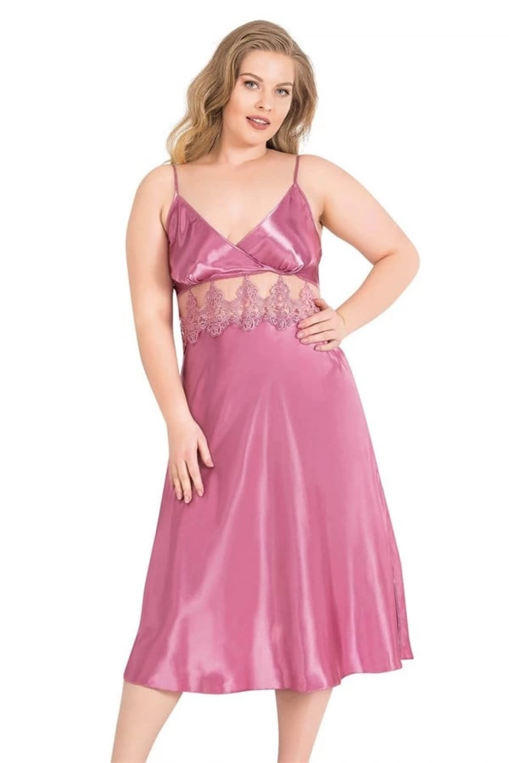 Aria's Büyük Beden Gül Kurusu Uzun İkili Saten Sabahlık Gecelik Takımı 6165