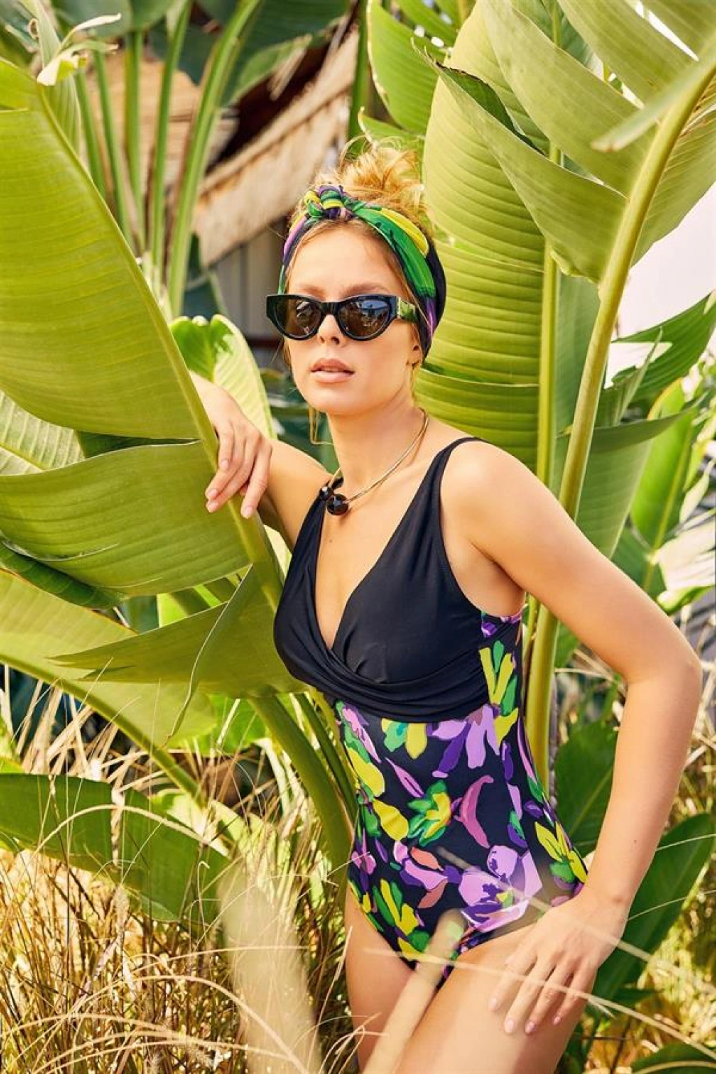 Büyük Beden Siyah Çiçek Desenli Drapeli Mayo