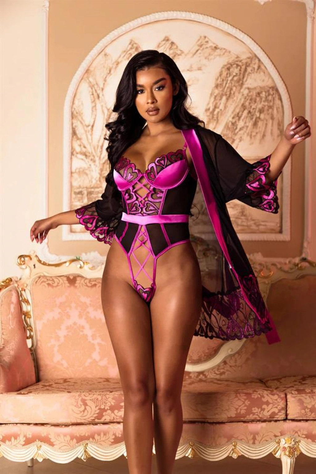 Fuşyanın enerjisi, kalp desenlerinin romantizmi ve ince dantel işlemelerle birleşerek büyüleyici bir gece takımı yaratıyor. Gecelik ve body uyumu, feminen hatları zarifçe sararken, aşk dolu detaylarla dolu özel bir tasarım sunuyor.
