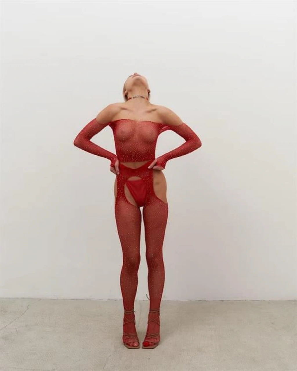 Özel Bölgesi Açık Kırmızı Taşlı Fantezi Vücut Çorabı