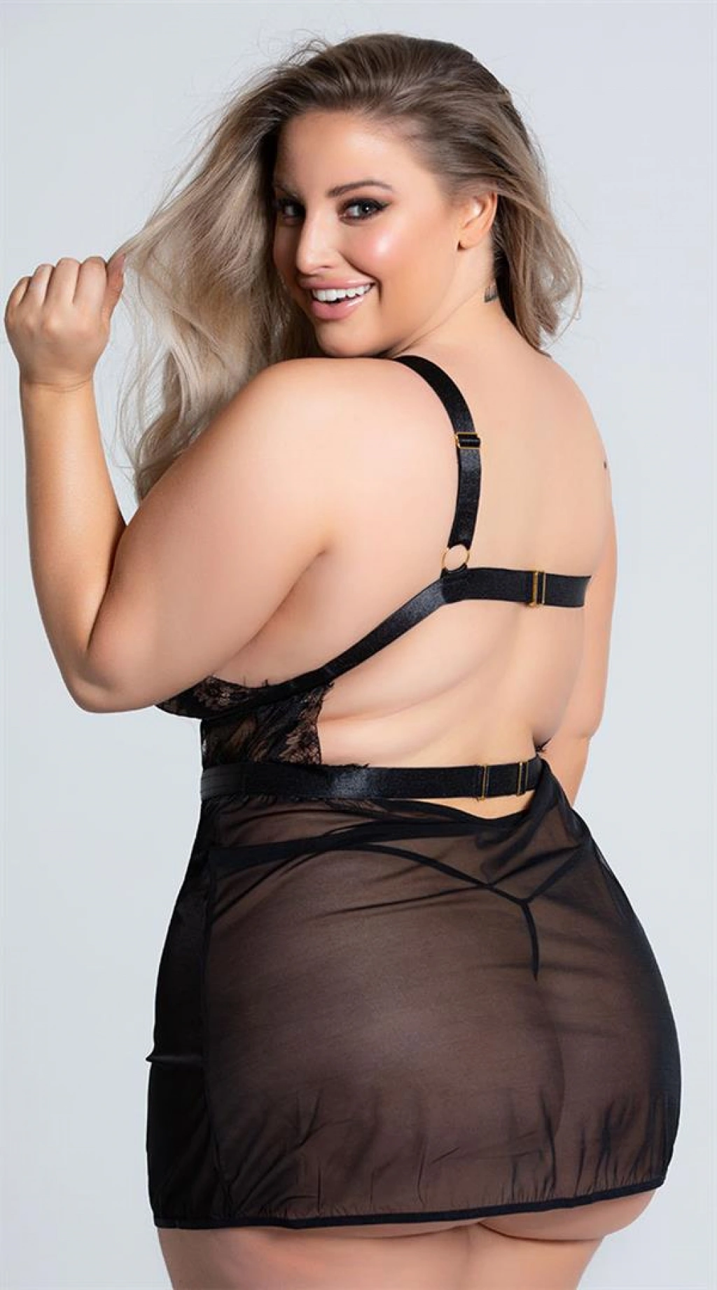Bu özel tasarım fantezi gecelik, büyük beden şıklığını cesur detaylarla buluşturuyor. Göğüs altındaki şerit detayları vücut hatlarını vurgularken, ayarlanabilir ince askılar ve hafif transparan kumaşıyla hem konfor hem de baştan çıkarıcılık sunuyor.