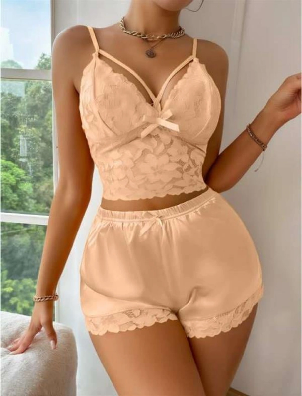 Sarı Dantelli Büstiyer İnce Askılı Saten Şortlu Takım