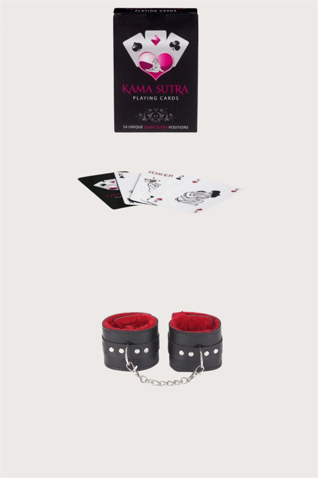 Sexy Görselli Oyun Kartı Kama Sutra Siyah Kırmızı Kelepçe Set