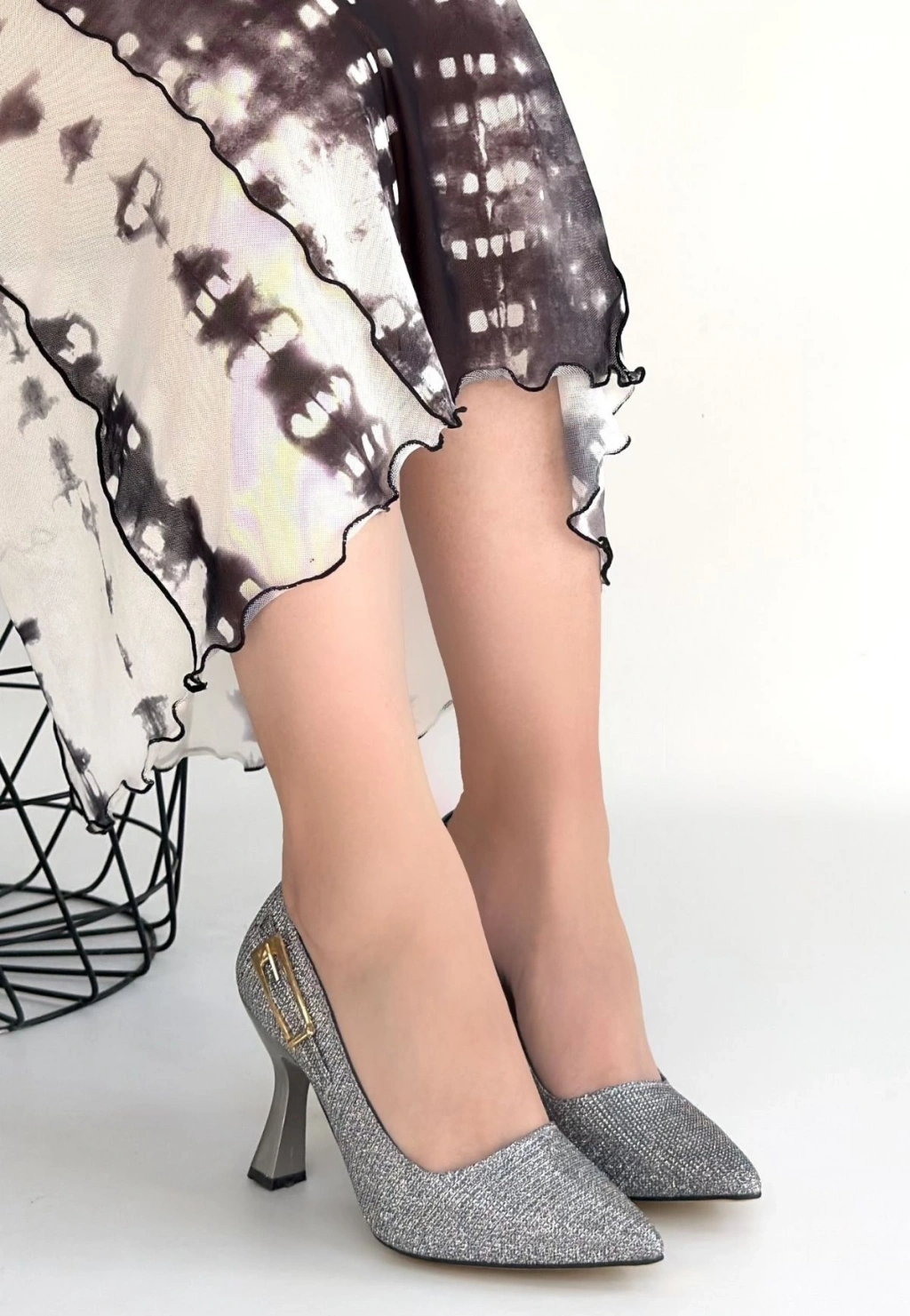 Cerin Gümüş Saten Simli Topuklu Ayakkabı