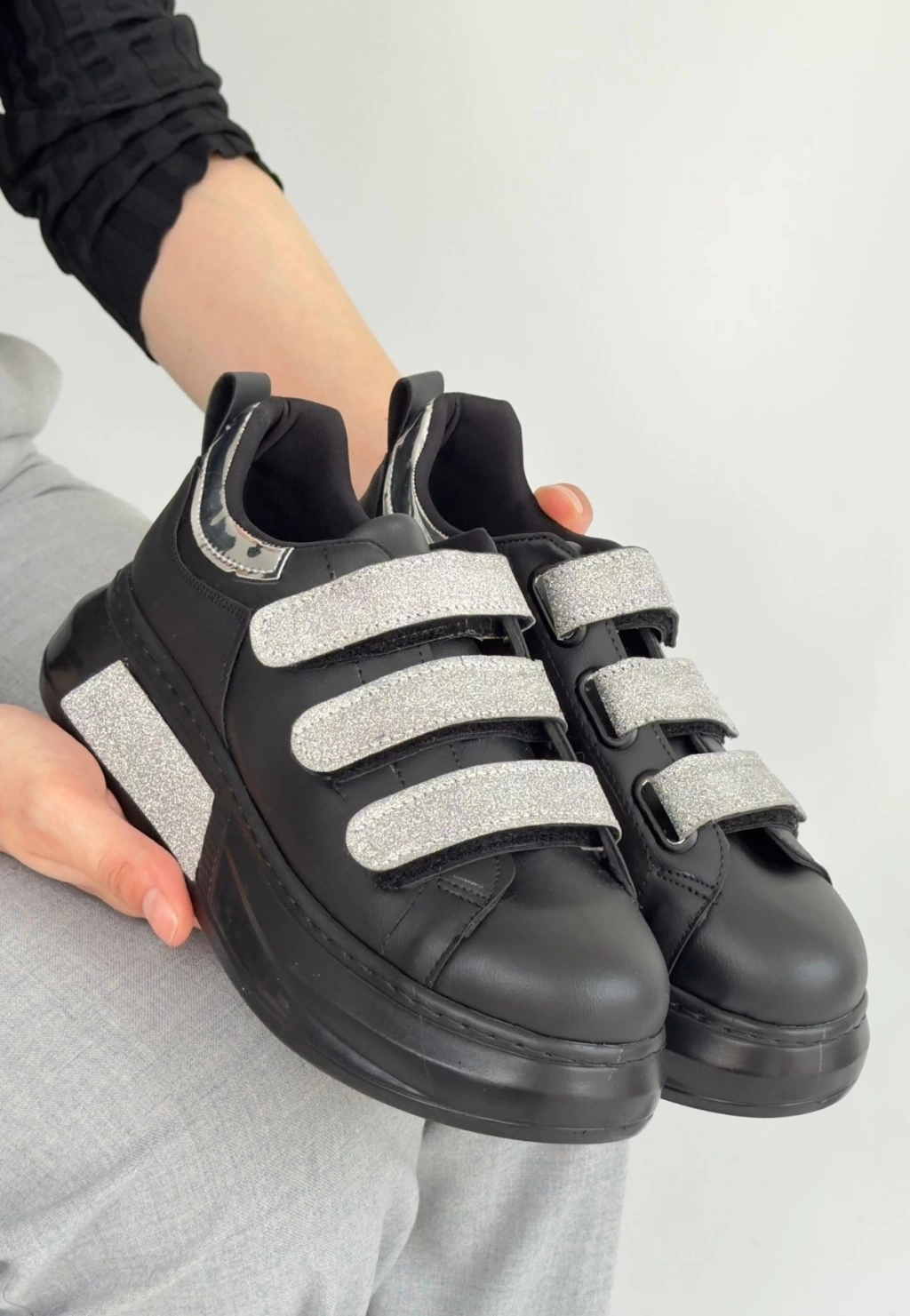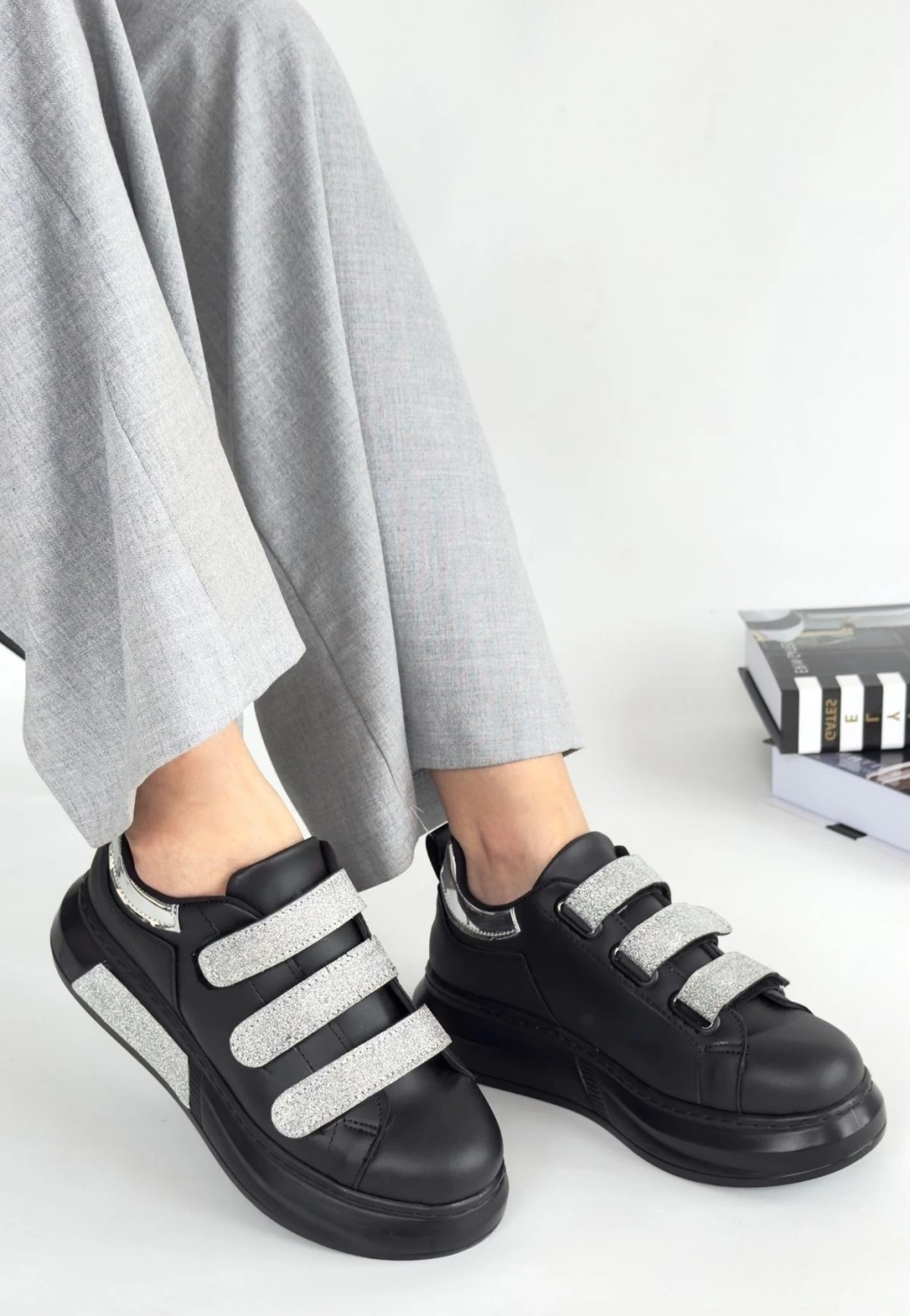 Elika Siyah Cilt Simli Cırt Cırtlı Spor Ayakkabı