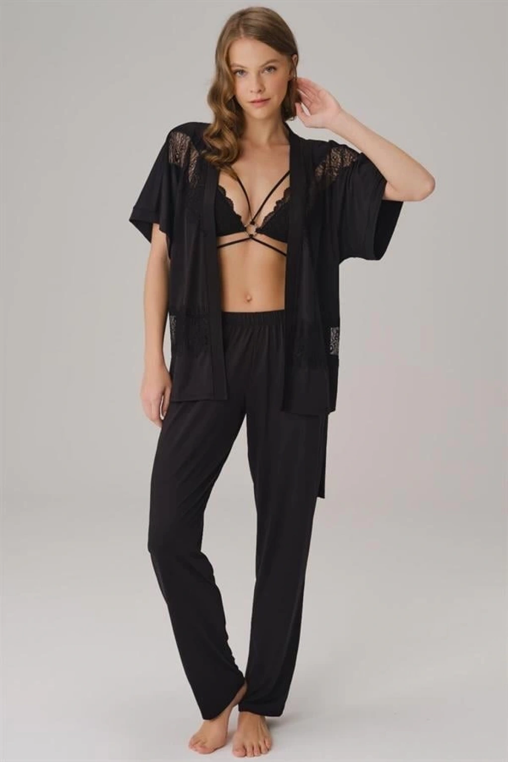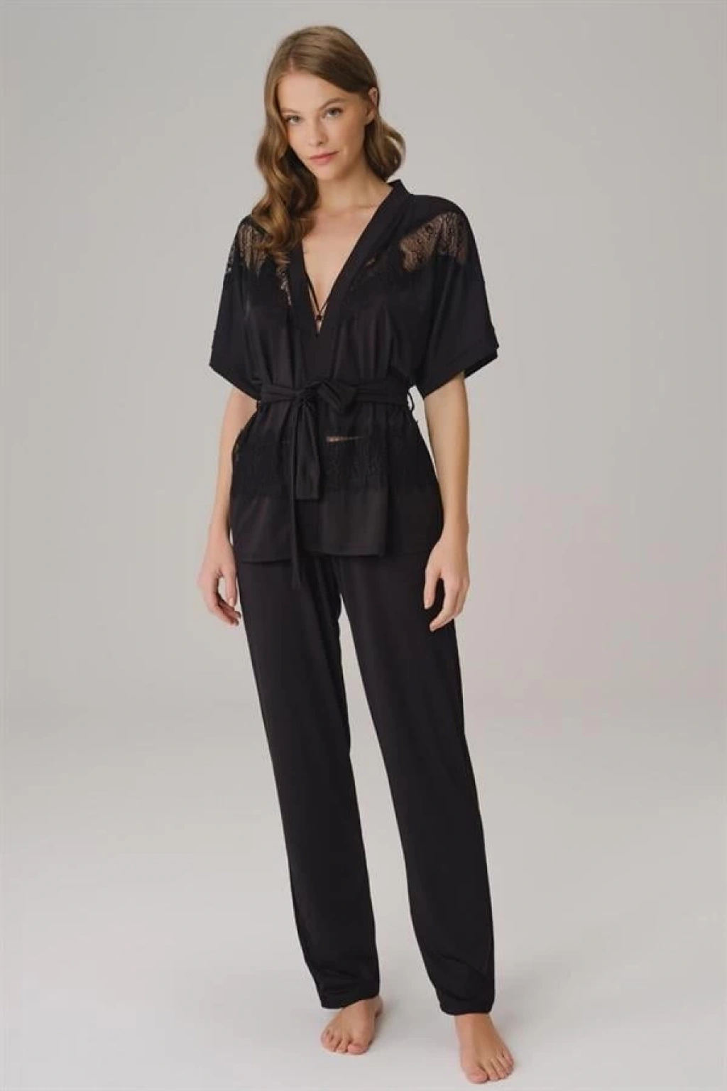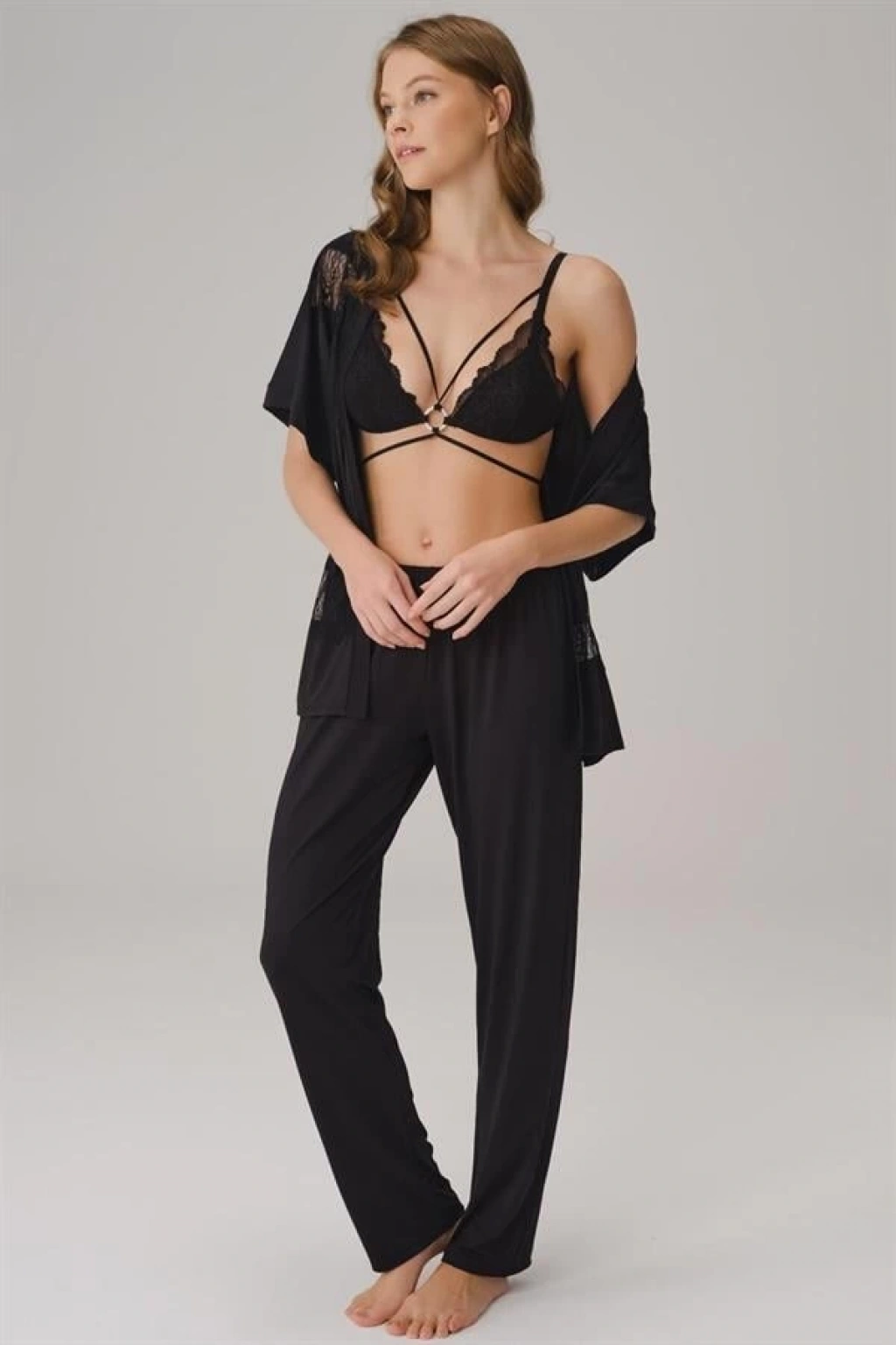 Aria's İp Askılı V Yaka Düz Yazlık Uzun Dantel Detaylı Pijama Takımı Sabahlık