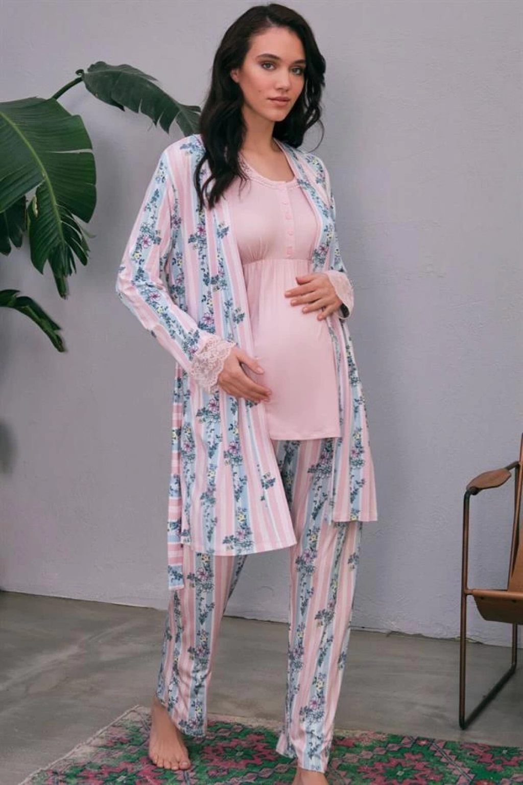 Kadın Viskon Hamile Lohusa Dantelli Sabahlık Önden Açılan Emzirme T-Shirt ve Pantolon Pijama 3'lü Takım (5651)