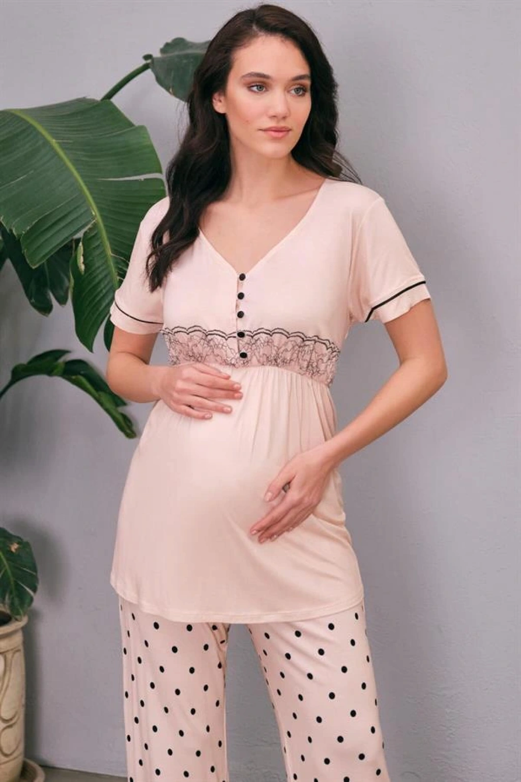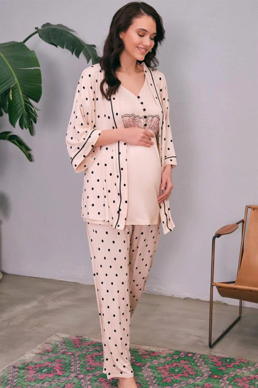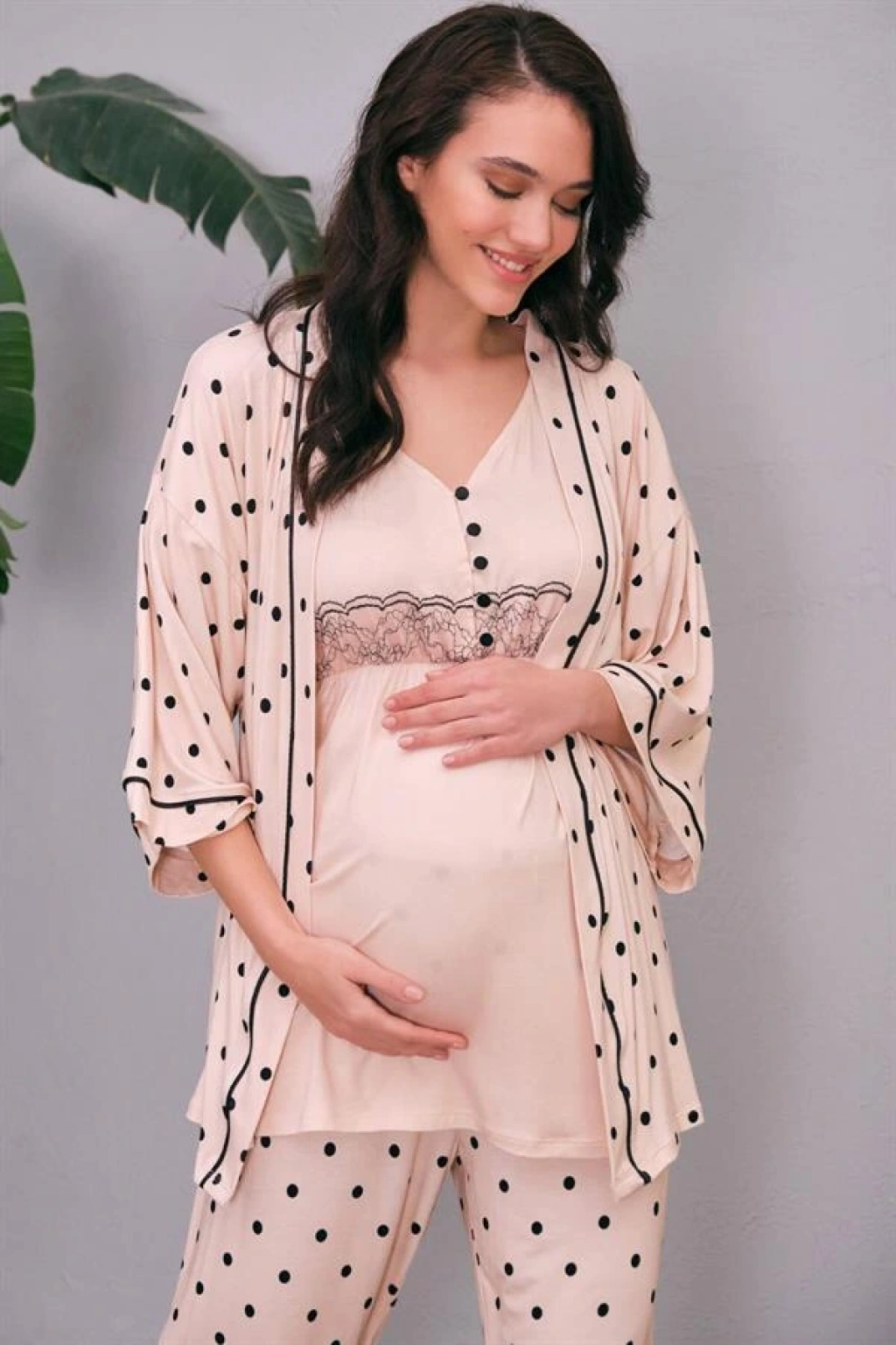 Kadın Viskon Hamile Lohusa Puantiyeli Sabahlık Önden Açılan Dantelli Emzirme T-Shirt ve Pantolon Pijama 3'lü Takım (5655)