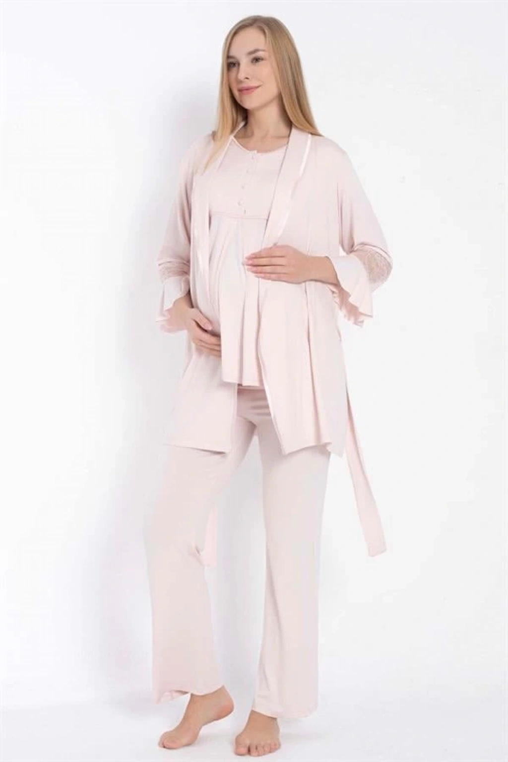 Hem şık hem konforlu olmayı isteyen anne adayları için özel olarak tasarlanan bu viskon hamile pijama takımı ve sabahlık seti, dantel detayları ve hafif dokusuyla lohusalık döneminde de zarif görünmenizi sağlar. Bisiklet yaka kısa kollu üst ve esnek bel yapısına sahip alt parçayla maksimum rahatlık sunar. Takımın tamamlayıcısı olan sabahlık, hem şıklık hem mahremiyet sunar.