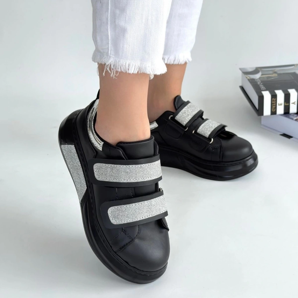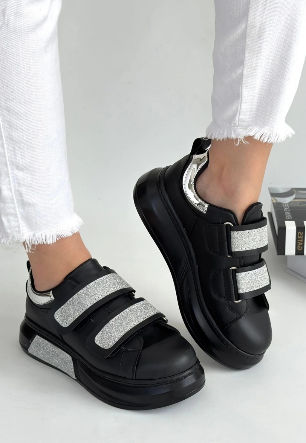 Nino Siyah Cilt Simli Cırt Cırtlı Spor Ayakkabı