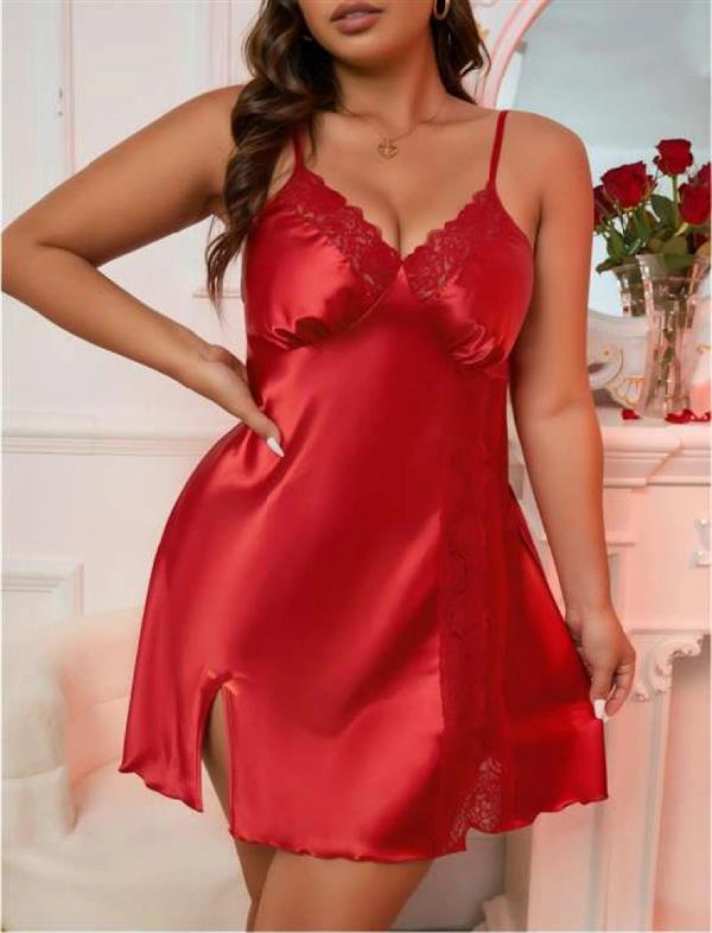 Büyük Beden Kırmızı Dantel Detaylı Saten Gecelik