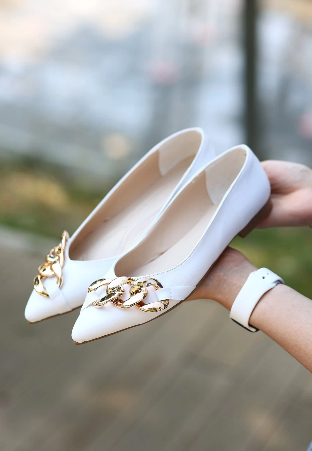 Popi Beyaz Cilt Zincirli Babet Ayakkabı