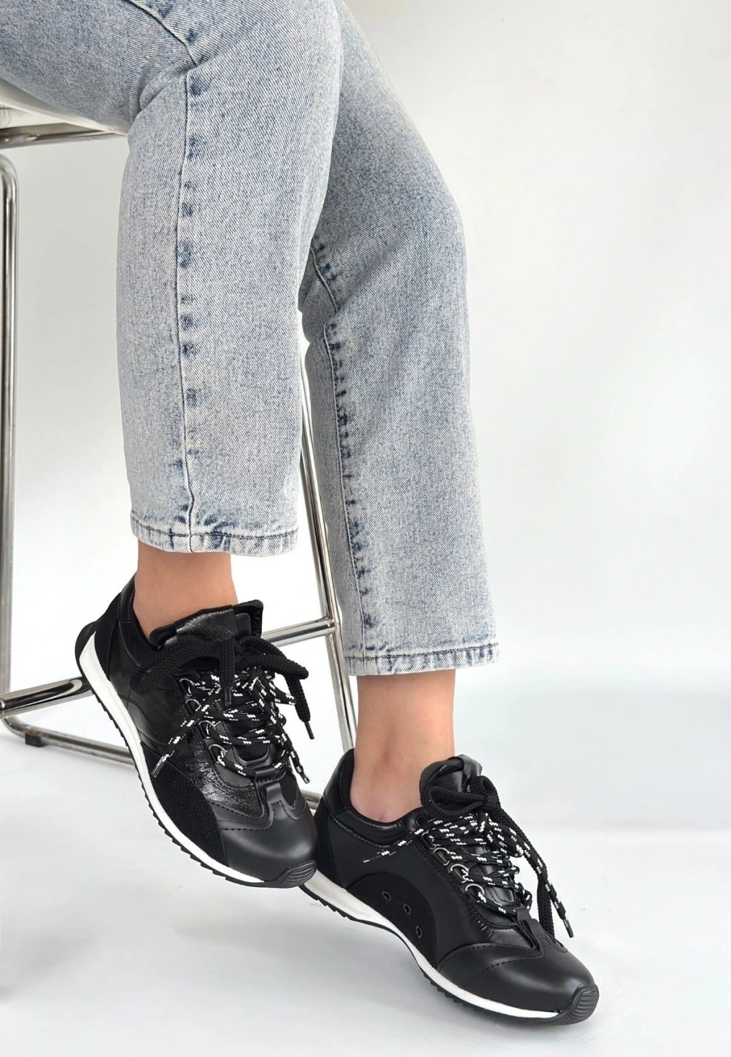 Ranu Siyah Cilt Paraşüt Detaylı Bağcıklı Spor Ayakkabı