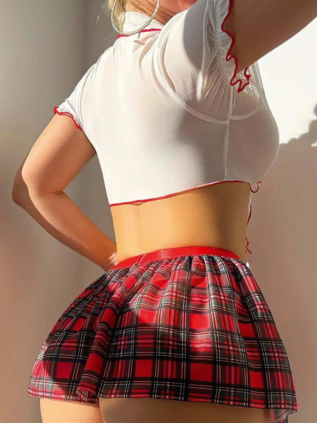 Bağlamalı üst kısmı vücudu zarifçe sararken, transparan tül dokusu feminen bir dokunuş katar. Mini ekose eteğiyle kombinlenen bu takım, eğlenceli olduğu kadar baştan çıkarıcı bir görünüm sunar.