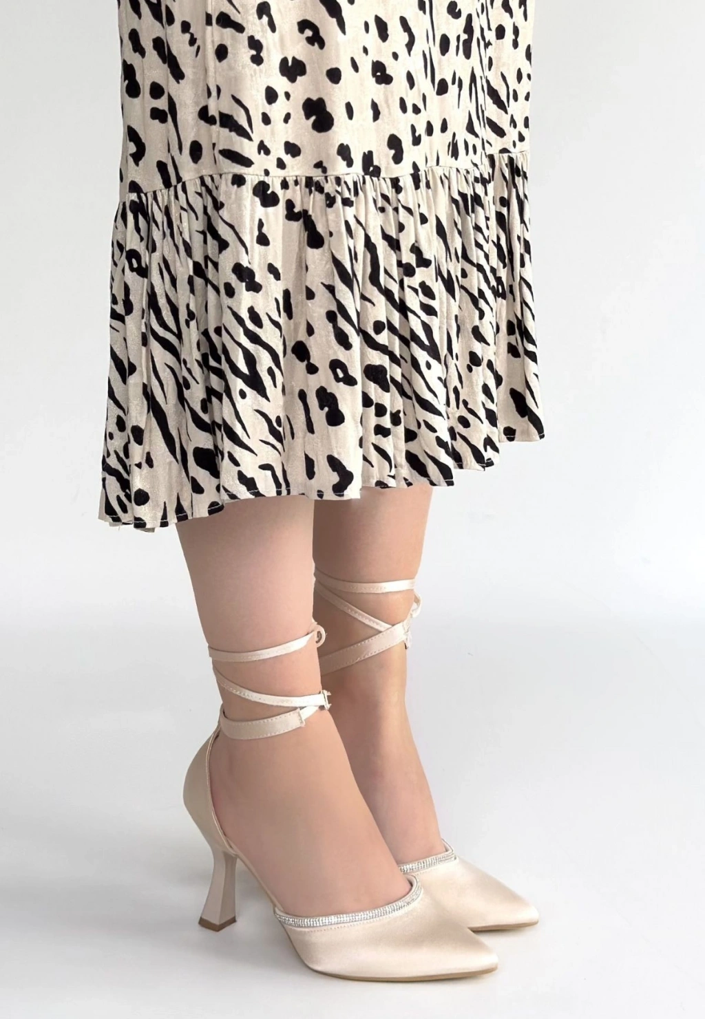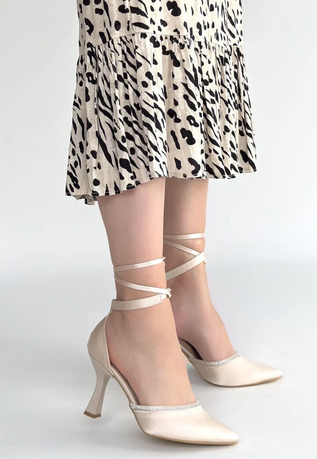 Tenja Bej Saten Bilekten Bağcıklı Topuklu Ayakkabı