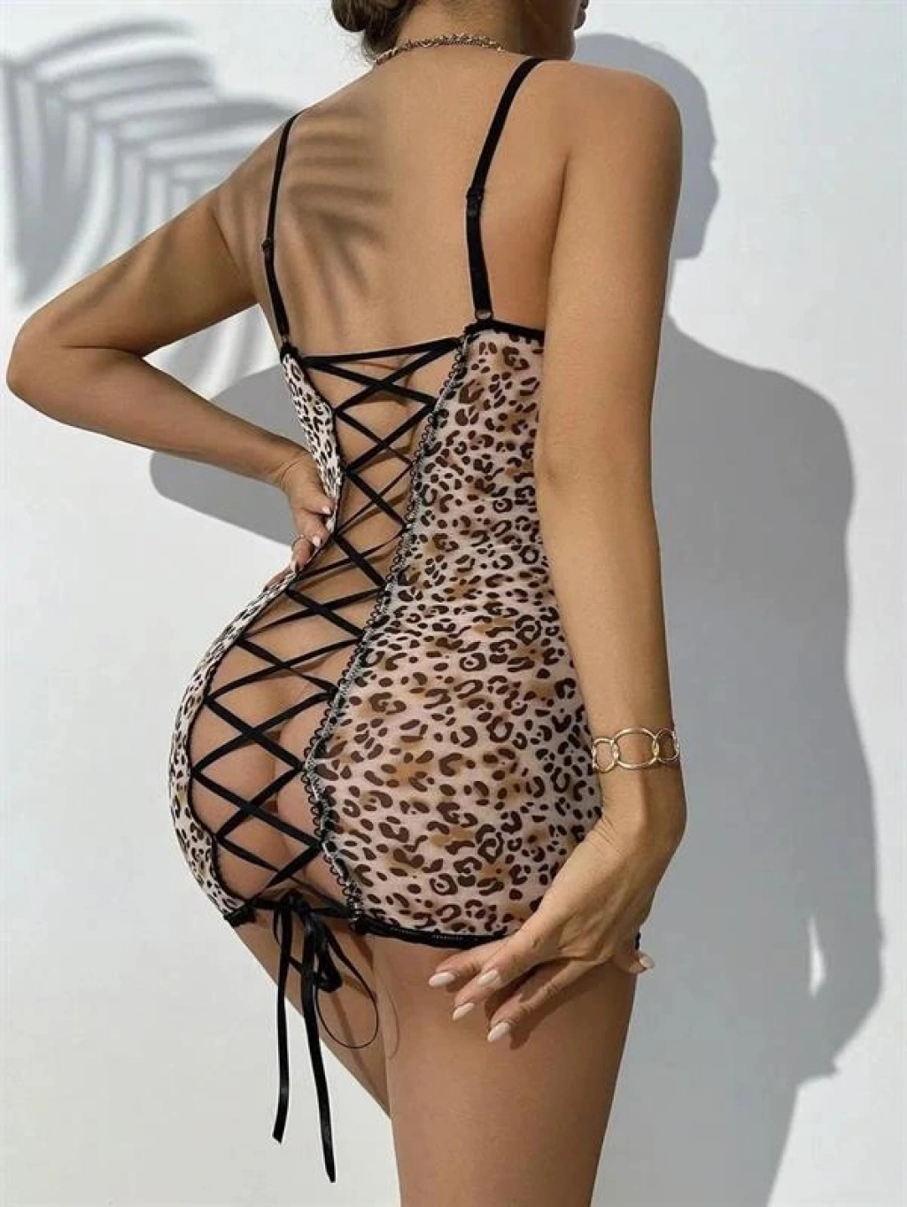 Vahşi çekiciliğini ortaya çıkar! Leopar desenli transparan tül kumaşıyla cesur, arkası çapraz ipli detayıyla büyüleyici bir görünüm sunan bu gecelik; zarafet ve tutkunun mükemmel birleşimi.