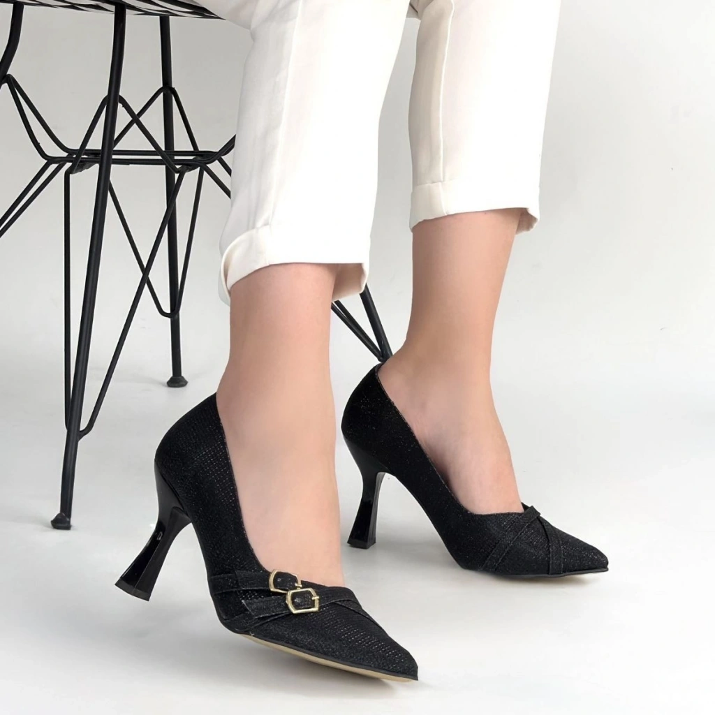 Wenda Siyah Simli Cilt Topuklu Ayakkabı