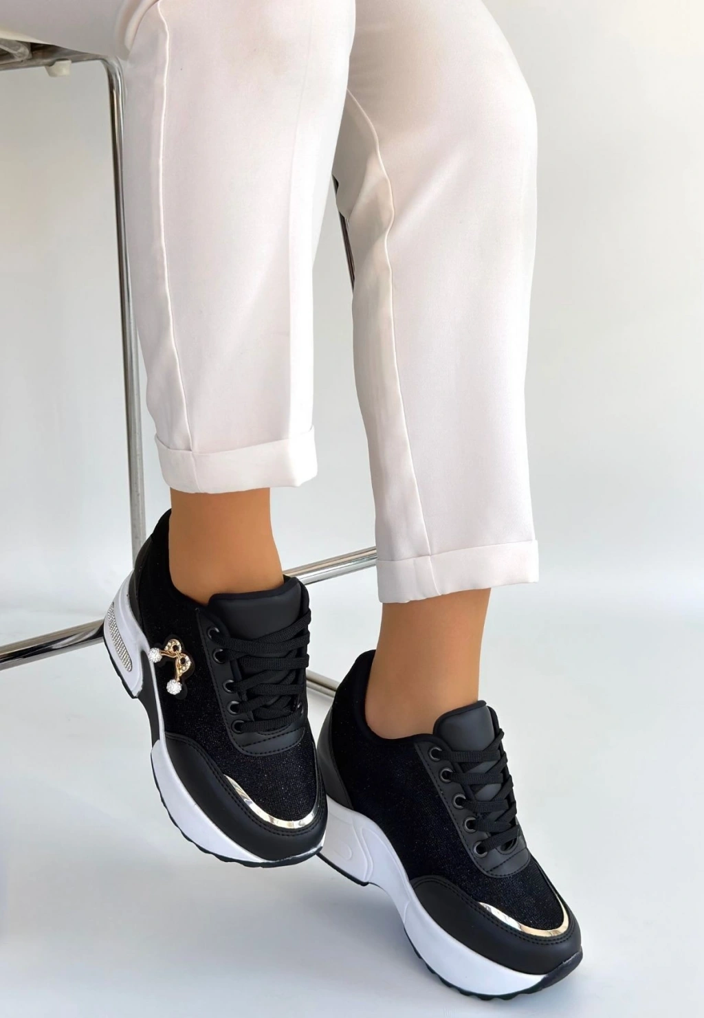 Wody Siyah Cilt Simli Bağcıklı Spor Ayakkabı