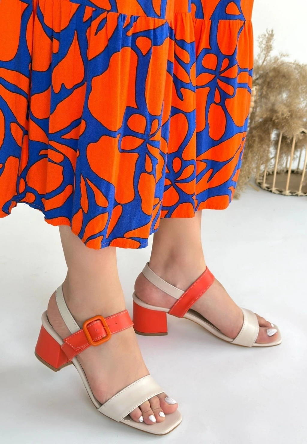 Year Bej Cilt Turuncu Detaylı Turuncu Topuklu Topuklu Ayakkabı
