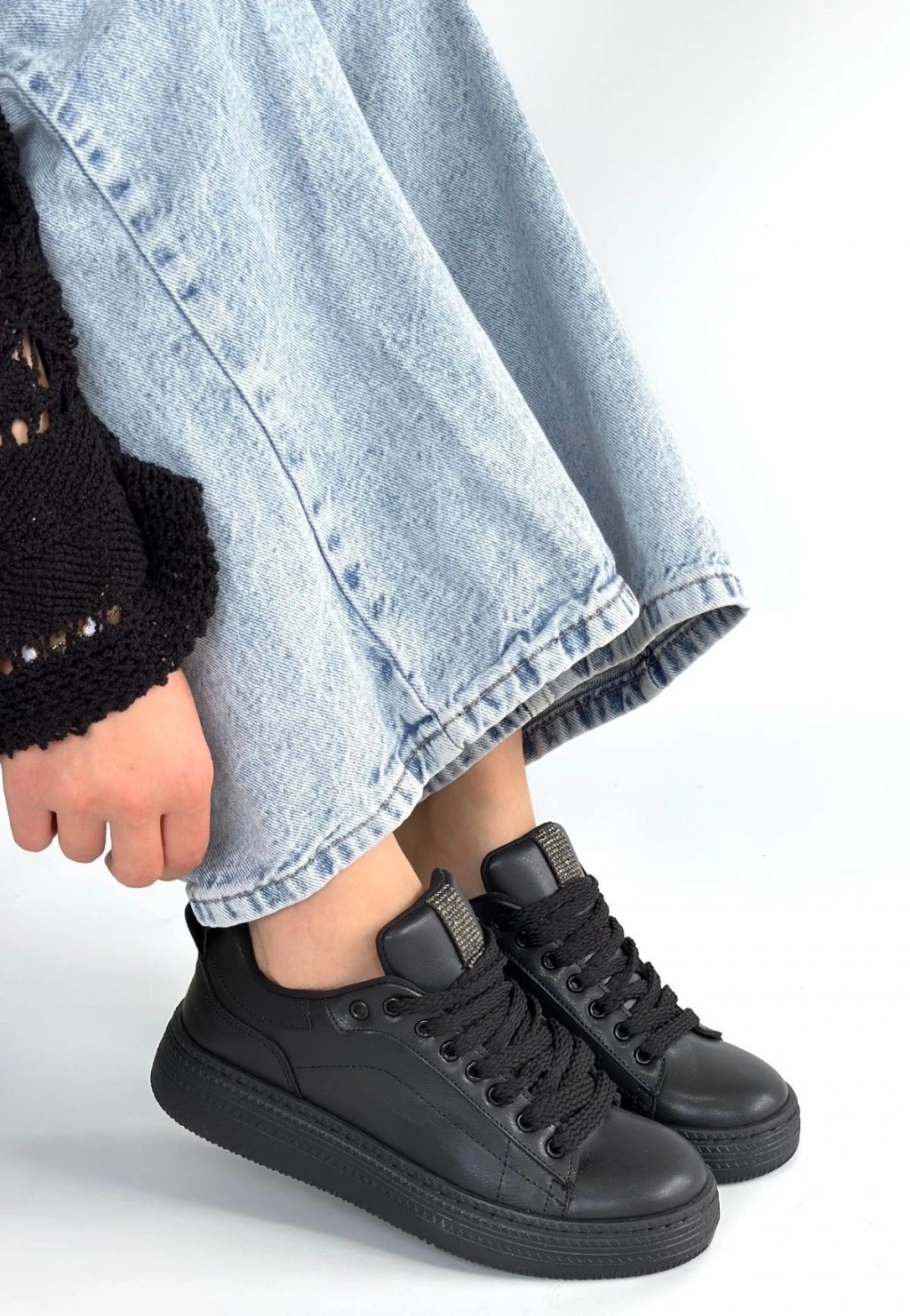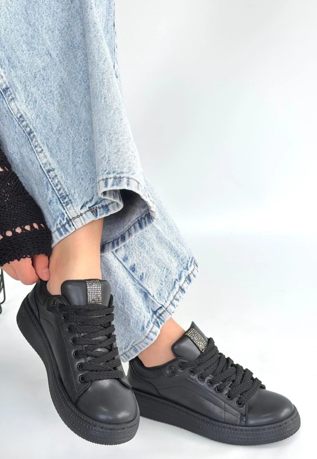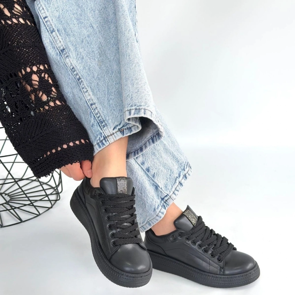 Yier Siyah Cilt Bağcıklı Spor Ayakkabı